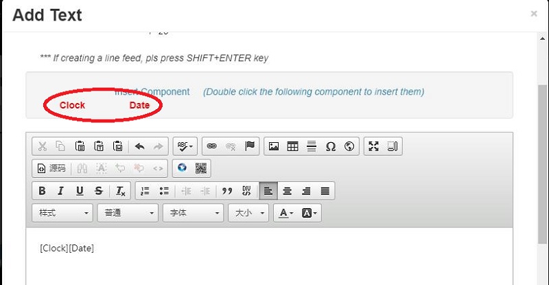 In the program design page, find the area where you want to add the clock, click the setting in the area, and select the Text content. In the pop-up dialog box, double-click the Clock Date button. Finally click Save.