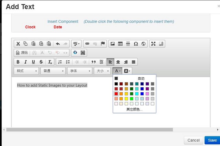 In the program design page, find the area where you want to add static text, click on the settings in the area, select the Text content, enter the static text you want to add, and click Save. Note: To set the background color of the text.