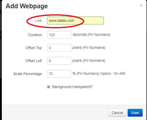 In the program design page, find the area where you want to add the page, click on the settings in the area, select the Webpage content. In the pop-up dialog box, enter the correct web address and click Save.